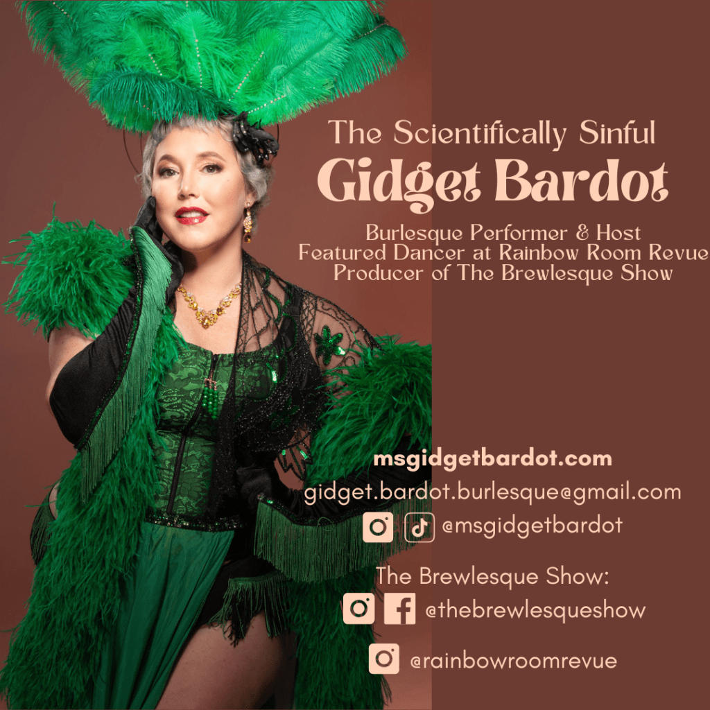 Gidget produces a quarterly burlesque revue, the Brewlesque Show, at the Corsair Distillery Taproom. She also produces private burlesque events upon request. She is a traveling showgirl, featuring in productions and burlesque festivals across the country. She is a resident dancer with the Rainbow Room Revue, performing at Skull’s Rainbow Room in famous Printer’s Alley.